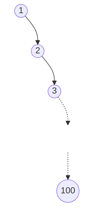 The resulting tree has for height the number of nodes, 100 in this case. Since looking up a value or inserting a value is linear in the height of the tree, this means that those operations takes 100 operations: the benefits of using a tree instead of a list is lost!